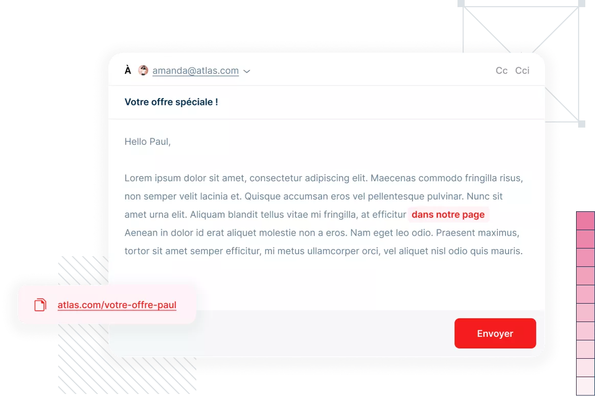 Accompagnez votre amil d’un lien vers une landing page dédiée pour augmenter l’expérience client. Grâce à nos templates de pages web des blocs prédéfinis, constituez)la simplement en retouchant vos images et en personnalisant les couleurs